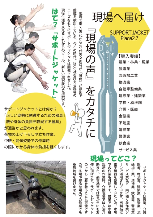 サポートジャケット (アシストスーツ・パワーアシストスーツ・パワードスーツ)は荷物や重量物の持ち上げ・持ち下げの際にかかる腰の負担・身体の負担を軽減する目的で開発された商品です。