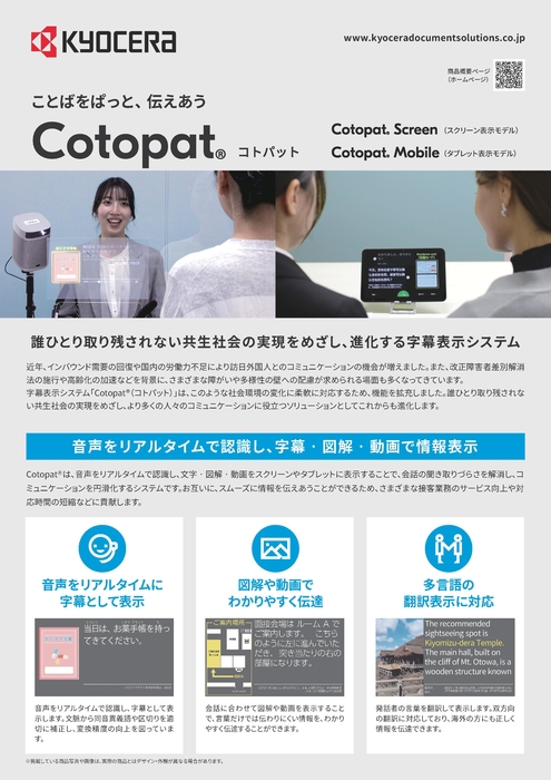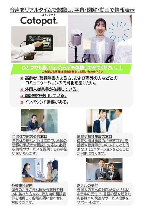 音声をリアルタイムで認識し、文字‧図解‧動画をスクリーンやタブレットに表示するシステムです。 会話の聞き取りづらさを解消し、コミュニケーションを円滑化します。